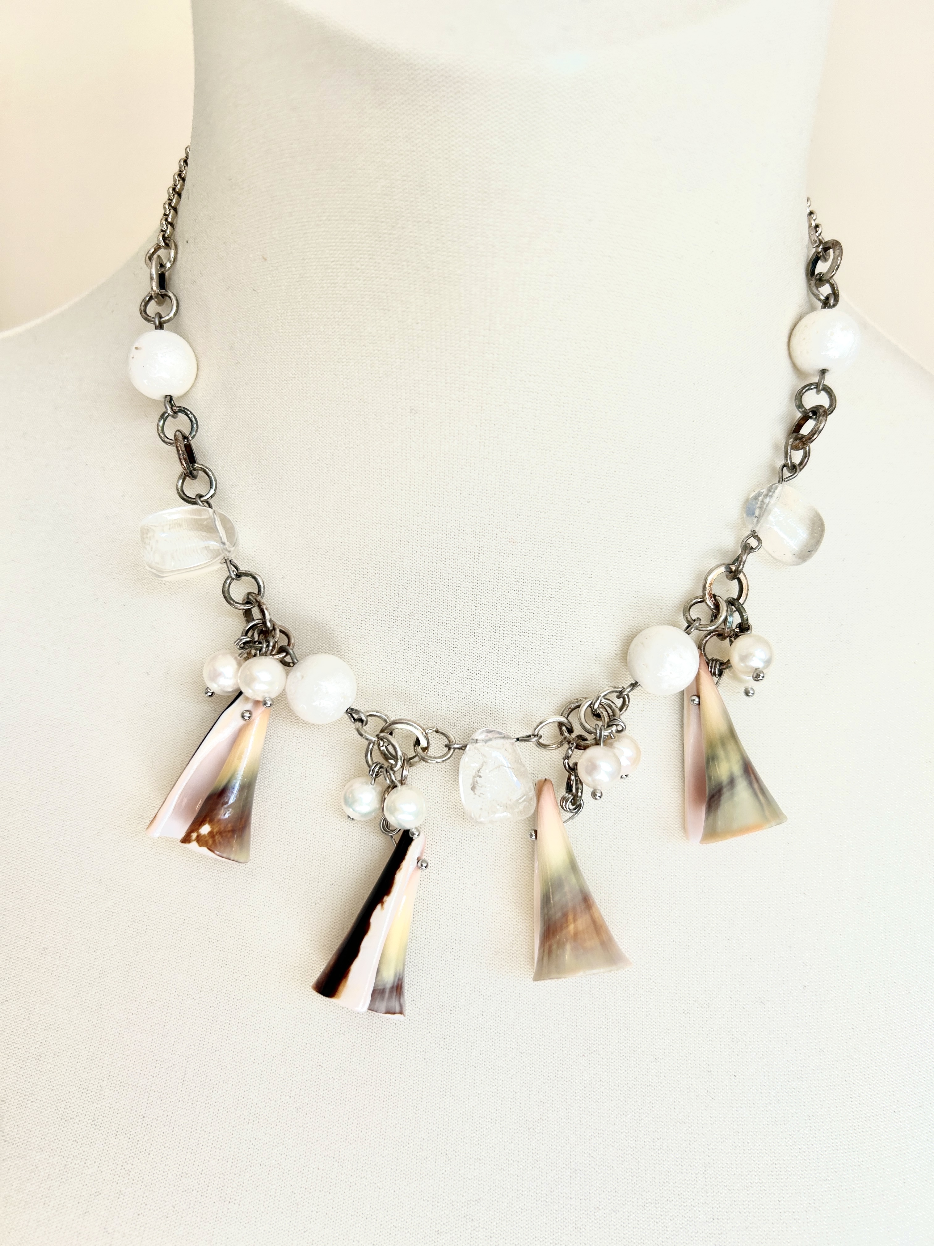 leichte Sommerhalskette, Silber mit weissen Meerschaum Perlen, Süßwasserperlen, Bergkristall und Muscheln.
