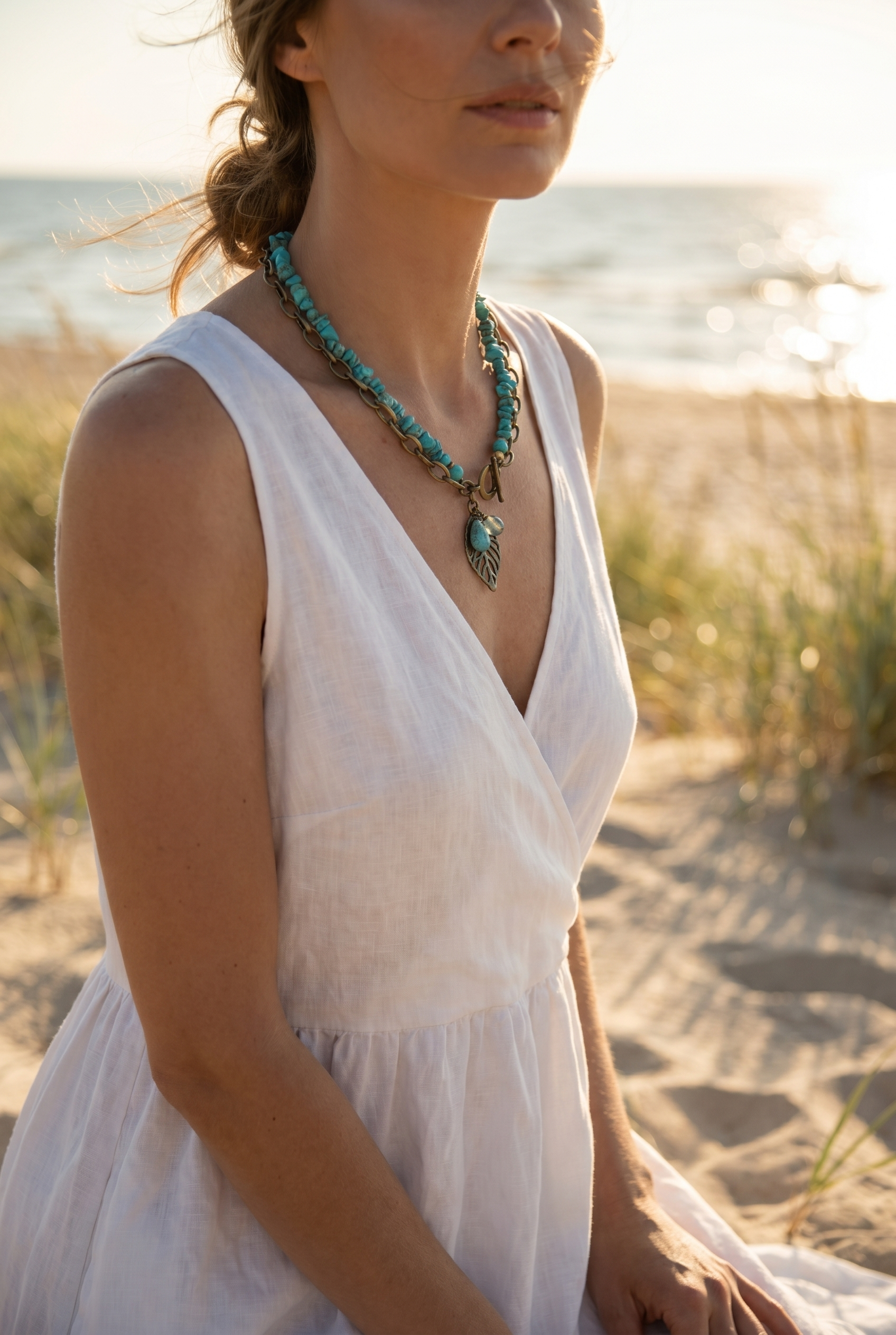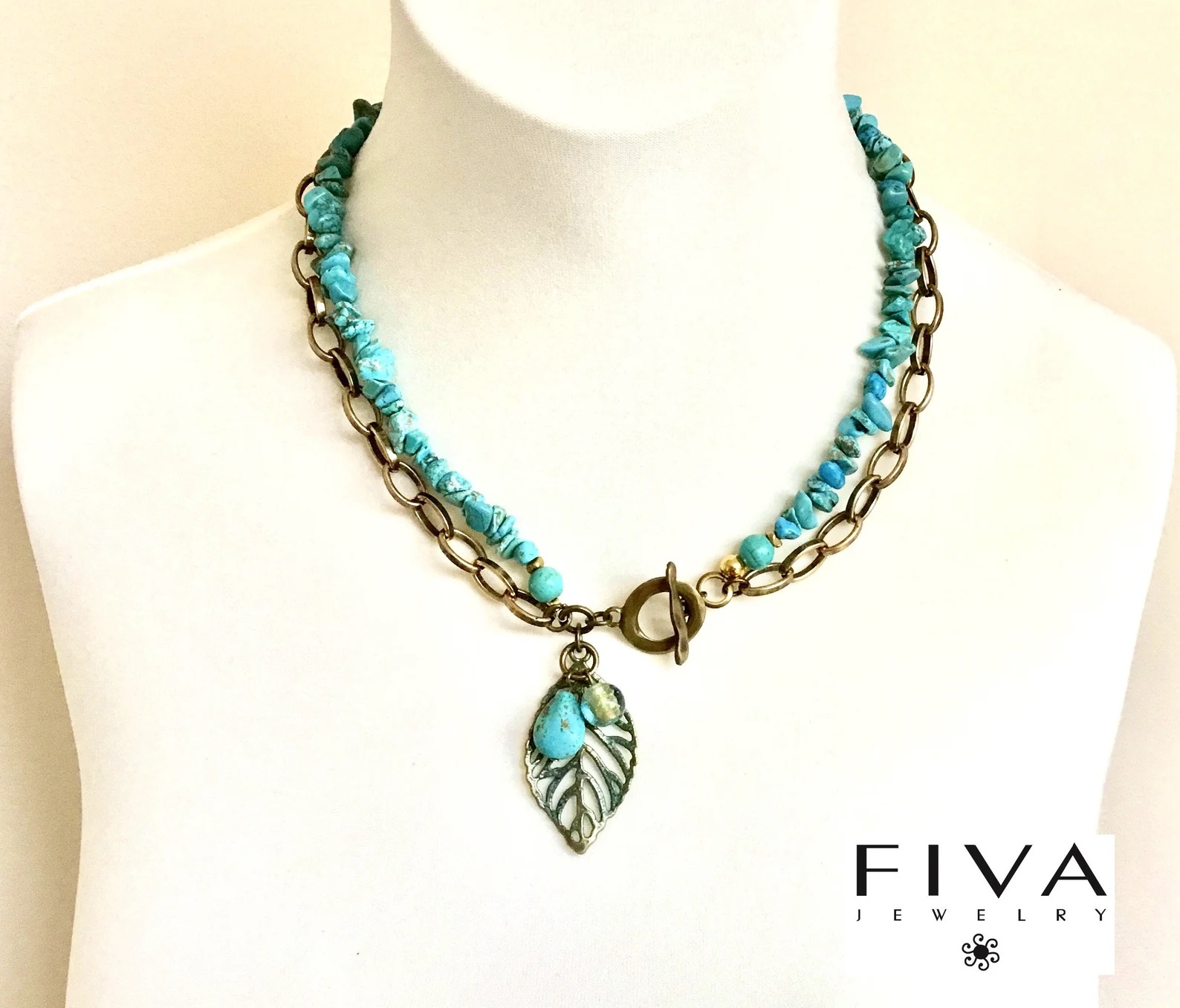 Rustikale Halskette mit Bronze-Kette und Türkissplittern.