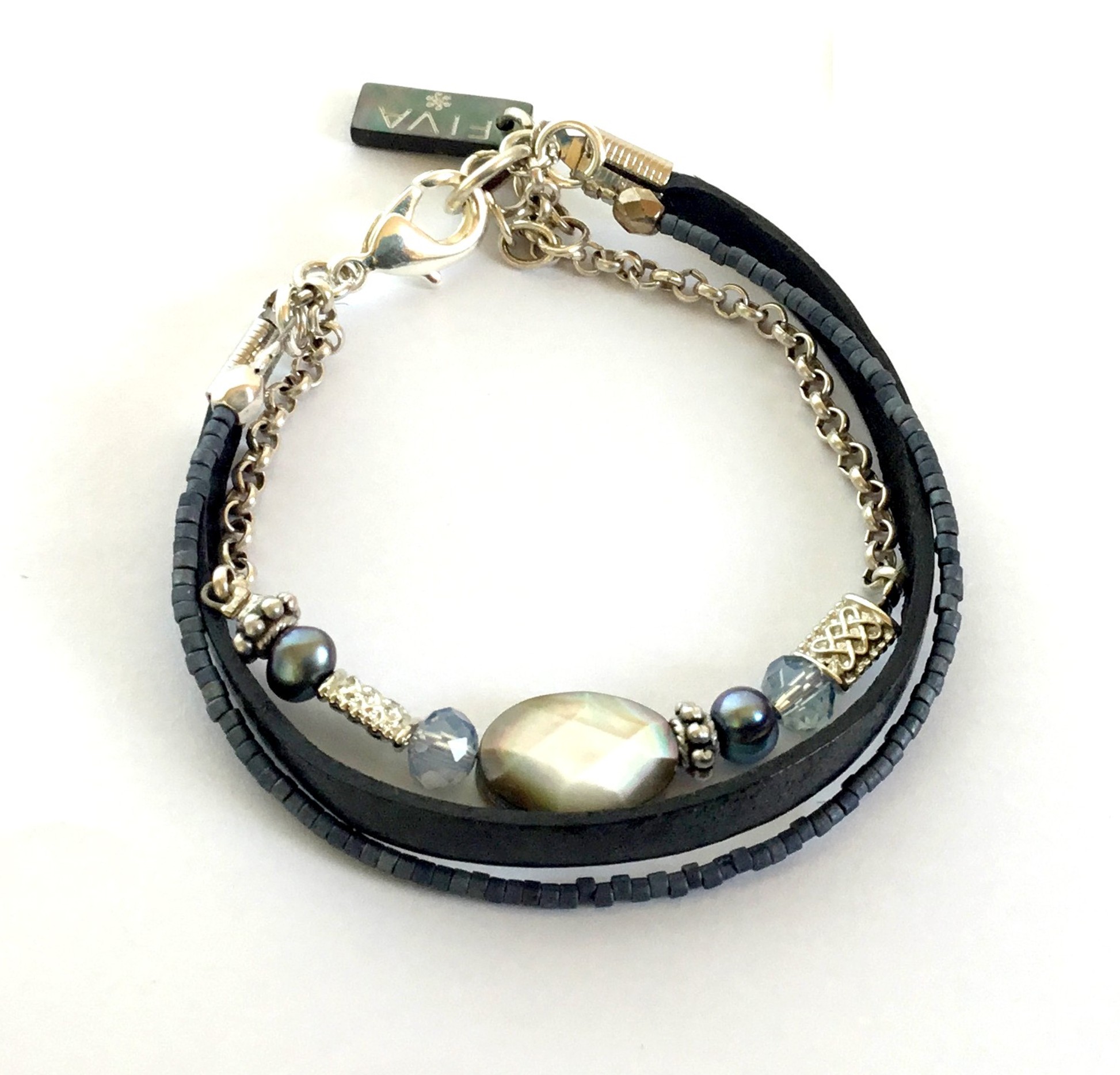 sporty elegant Fiva bracelet with a leather strap, a row of rocailles and a chain of mother-of-pearl and freshwater pearls in purple