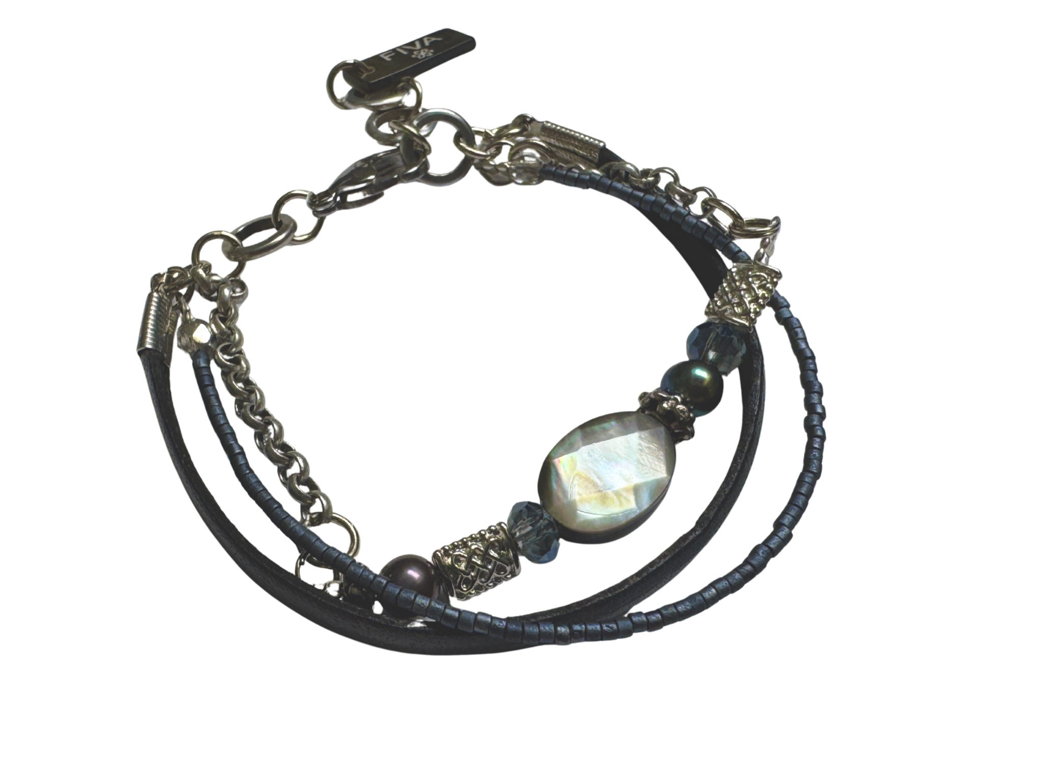 sporty elegant Fiva bracelet with a leather strap, a row of rocailles and a chain of... more