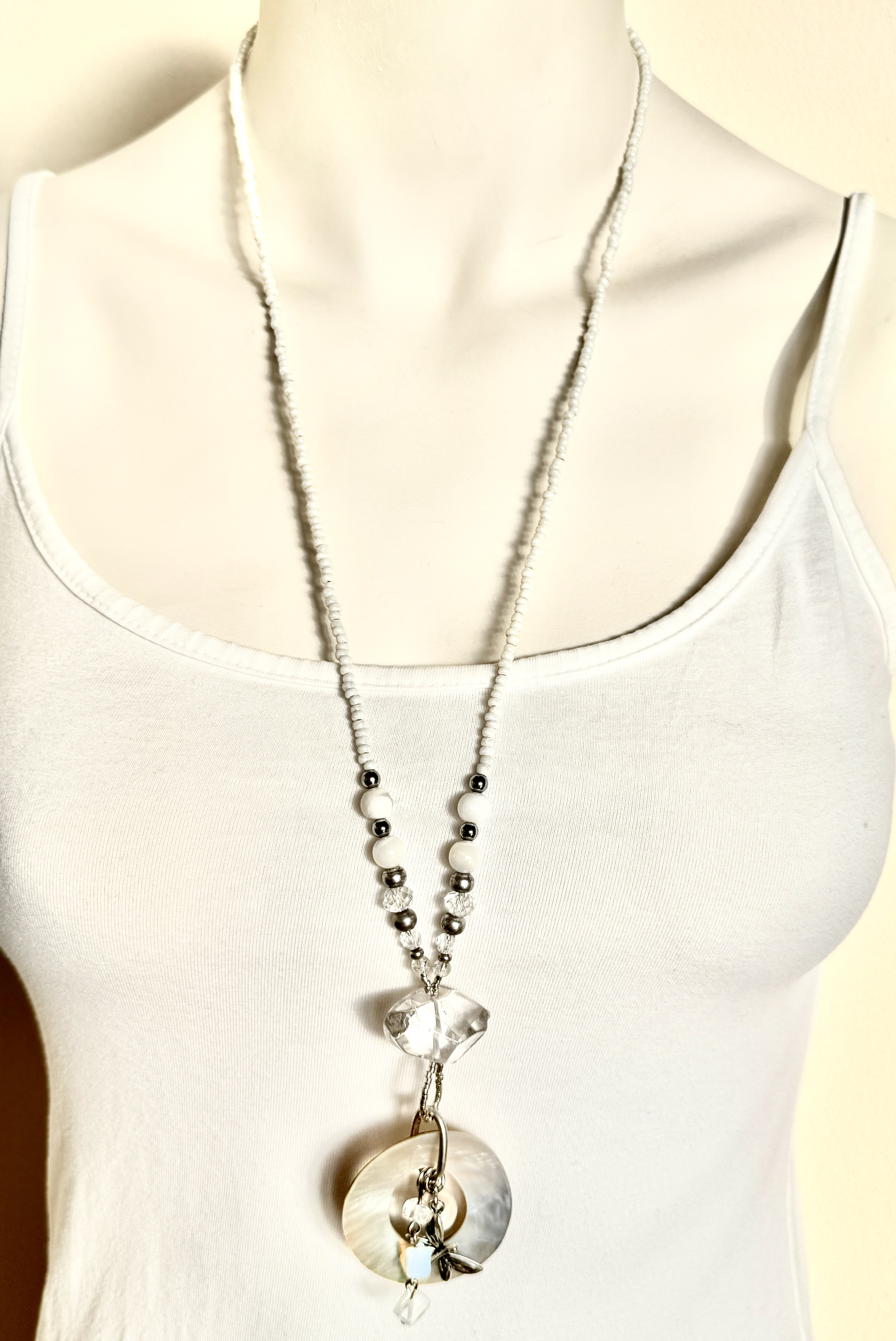 Long Fiva necklace, white seed beads with a beautiful rock-crystal, as well as a pendant of... more