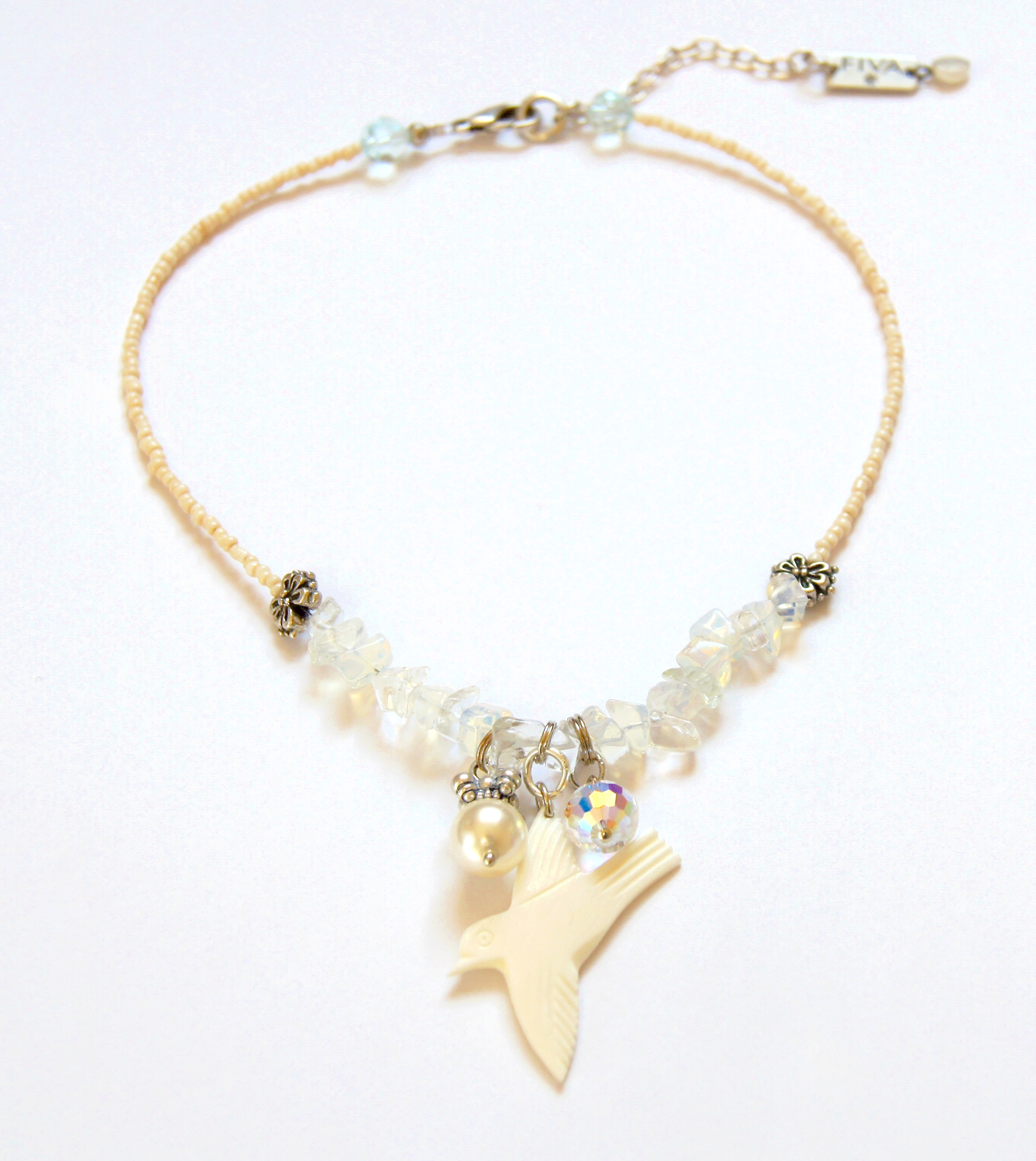 summery Fiva necklace with rustic rocaille in cream white, opalite pieces, a bird carved from bone, as well as Swarovski glass beads (facetted glass bead and a crystal pearl)
