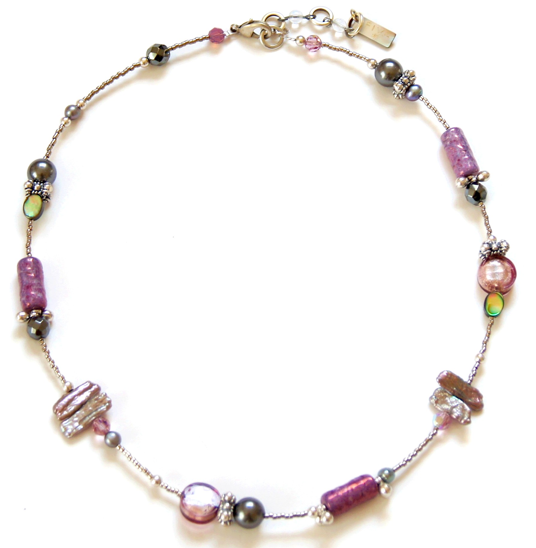 Fiva necklace with delicate shimmering mother of pearl beads, exotic abalone shell beads, special handmade Bohemian glass beads, freshwater pearls, Swarovski crystal pearls, metal beads and murano glass pearls with silver foil