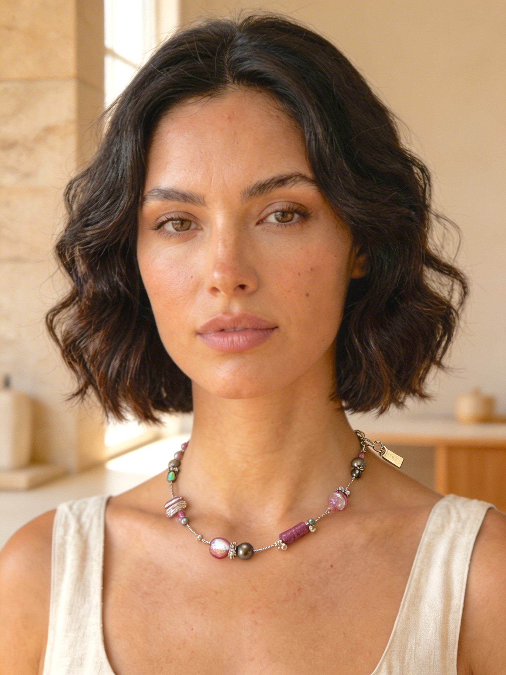 Fiva necklace with delicate shimmering mother of pearl beads, exotic abalone shell beads,... more