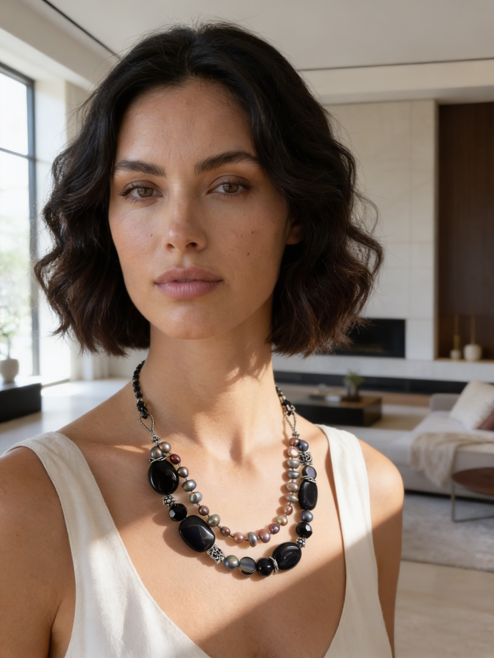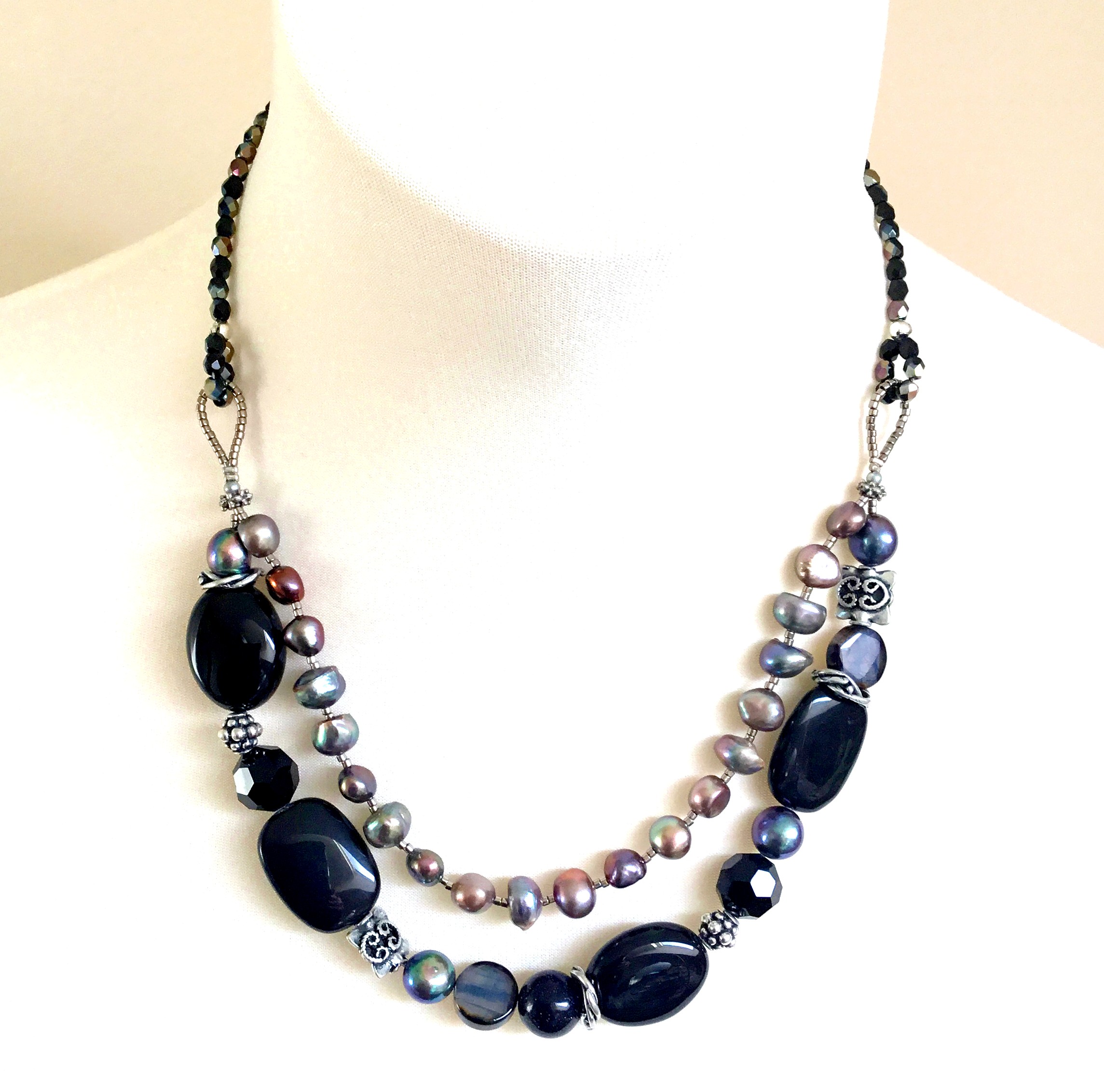 noble 2-row Fiva necklace made of onyx, metal and purple freshwater pearls more