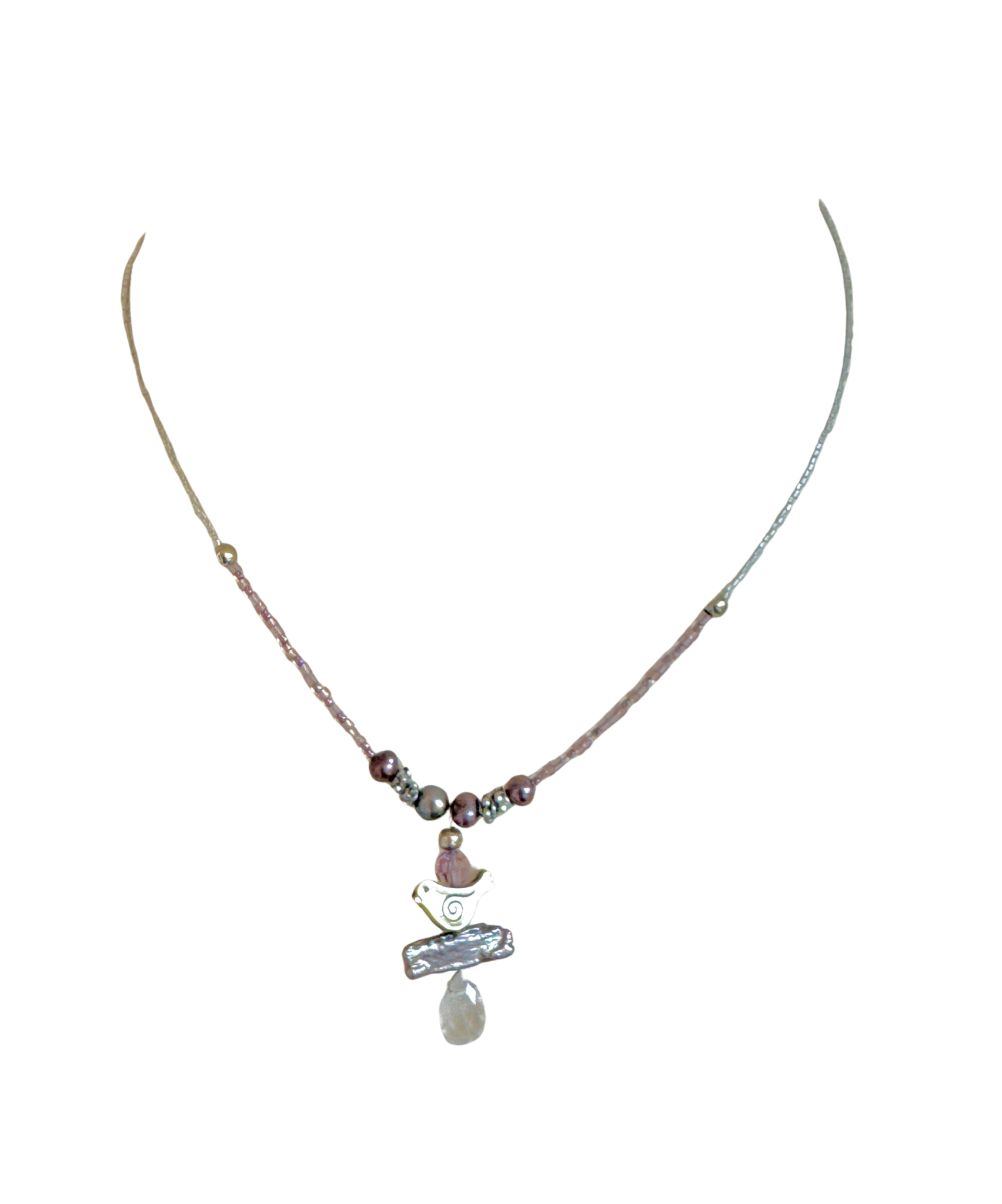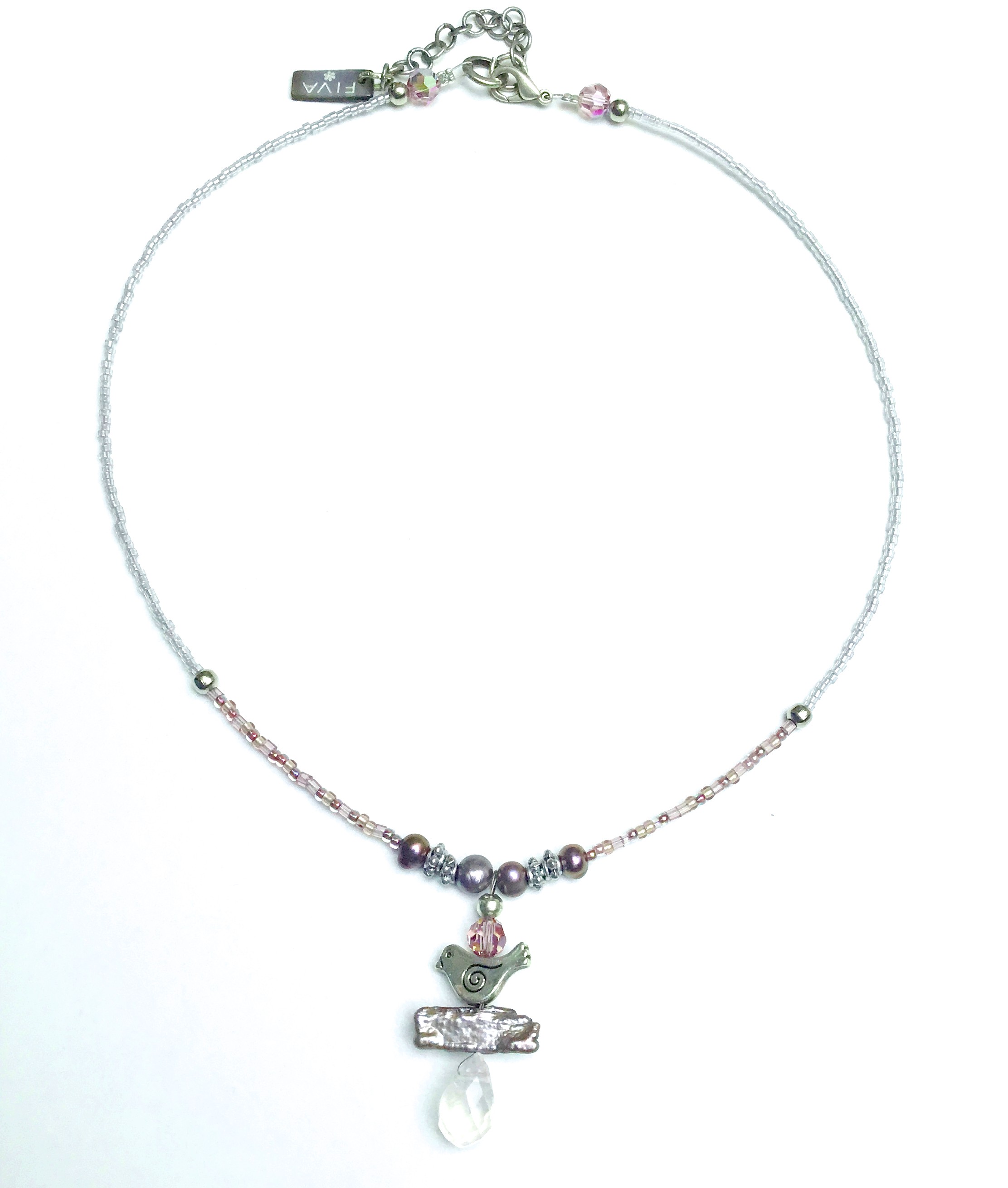 Fine Fiva necklace in silver and pink Japanese rocaille with a cute pendant from a metal bird sitting on a pearl bar and a rose quartz drop