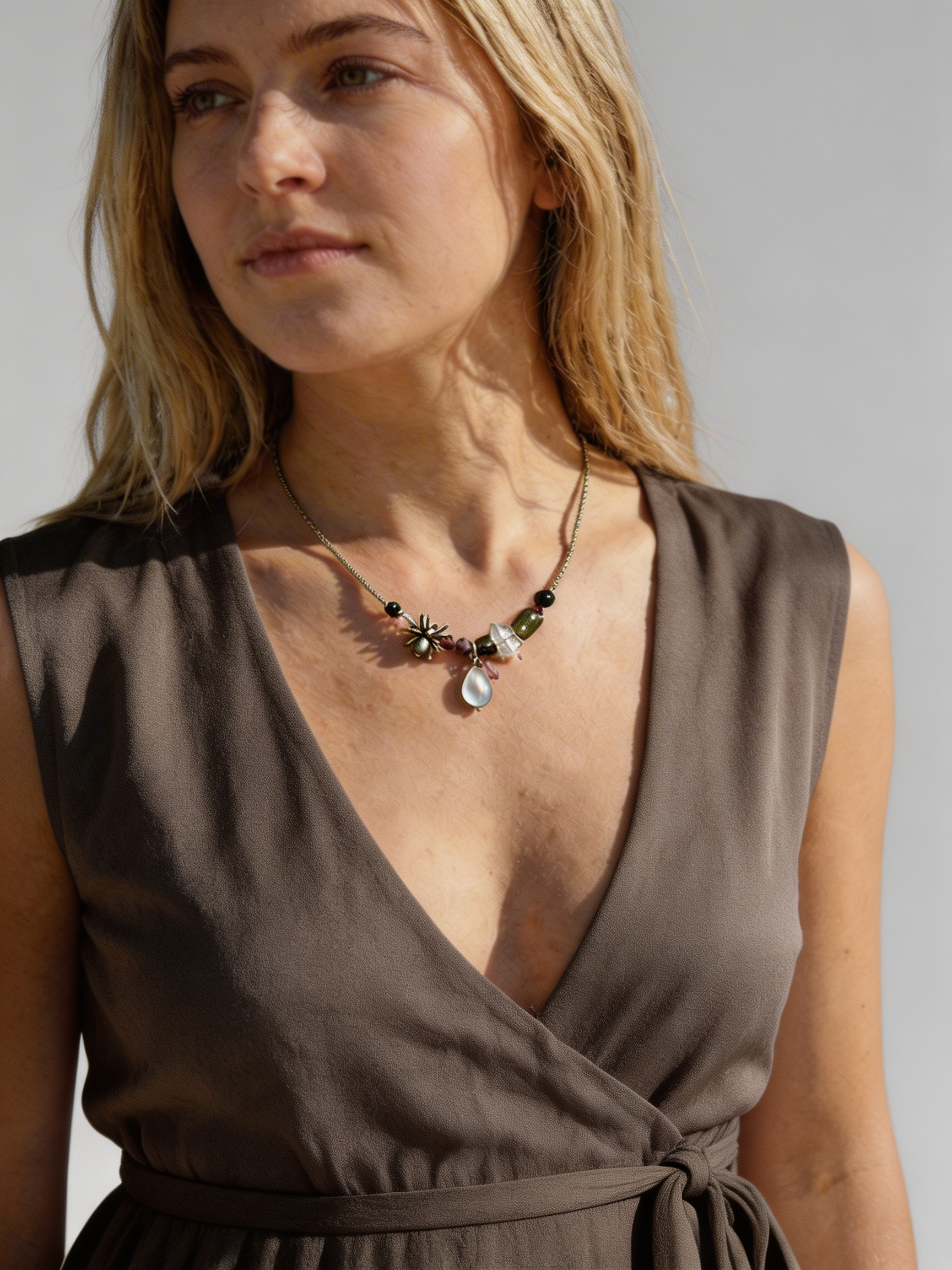 Niedliche Halskette aus versilberten Japanischen Rocailles, Bergkristall-Spitze, handgemachte Böhmische Glasperlen und schwarzem Perlmutt-Anhänger.