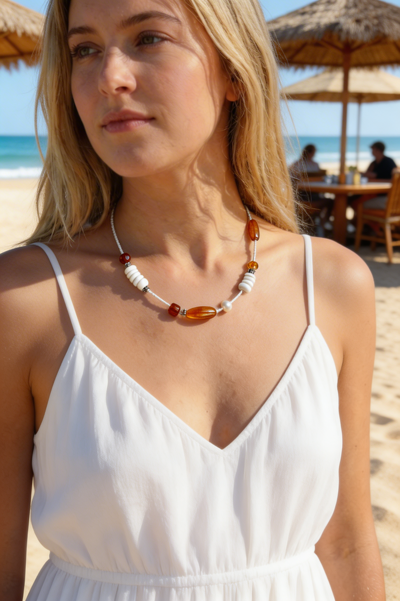 sportlich elegante Halskette aus weissen Japanischen Delica Rocailles, weissen Muschel- und Süßwasserperlen, sowie besonderen orangefarbenen Glasperlen.