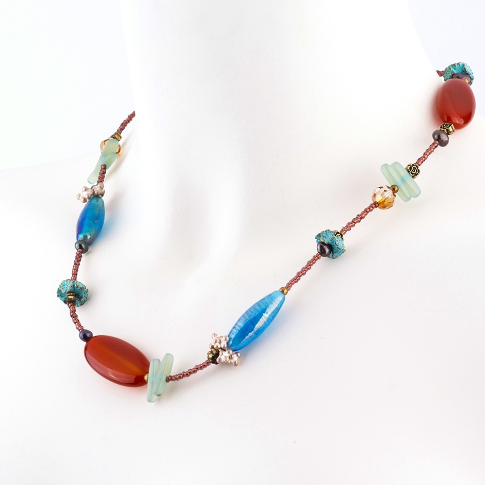 Fiva necklace with natural orange carnelian , Swarovski and Czech glass beads,... more